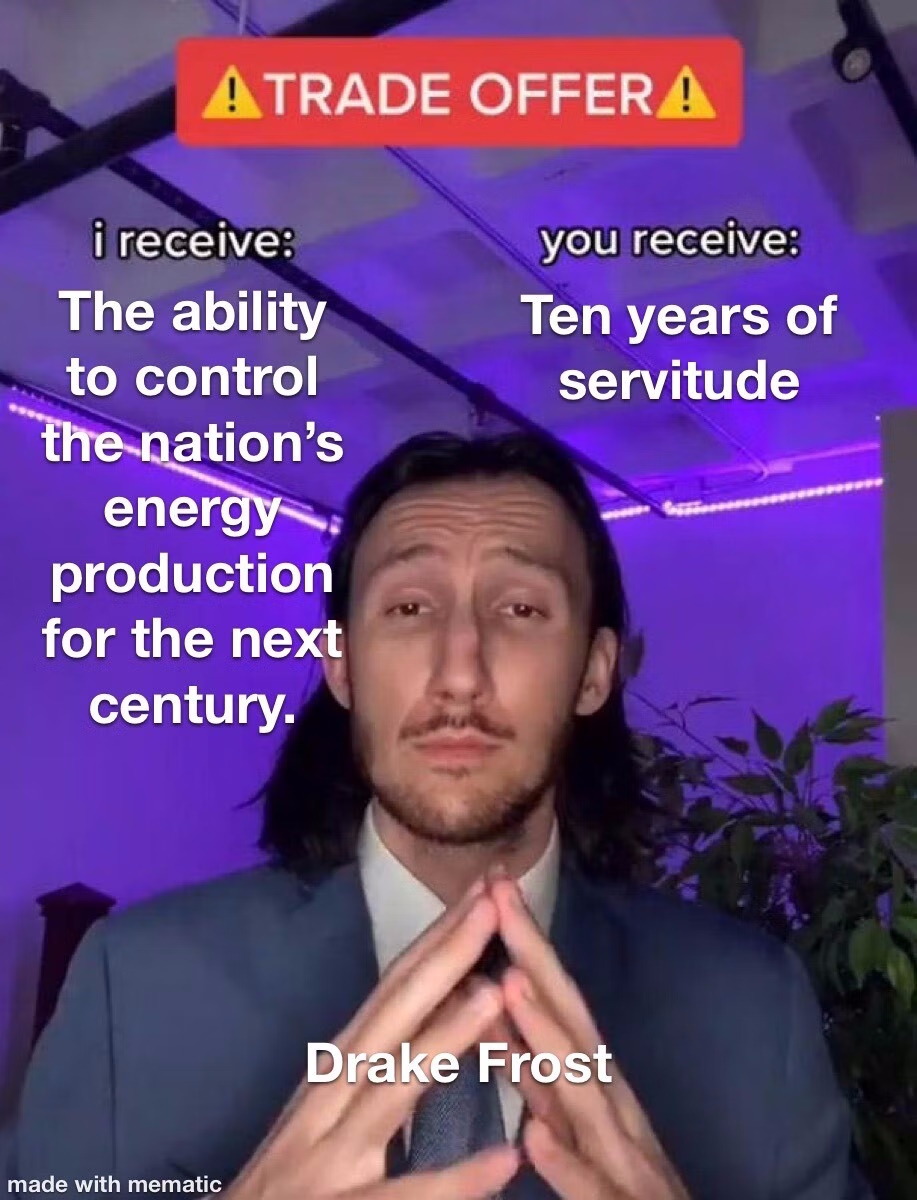 Frost arched an eyebrow. "Your resolve is admirable, my dear, I will give you that. So, since you haven't got much to say but 'no,' then I will do the talking instead." He adjusted himself in his chair. "I shall waste no more time, since mine is quite valuable. Our world is heading into an energy crisis. Finite resources cannot be replenished, the demand for energy is higher than ever. Oh, that's right." He said, putting his finger to his chin. "Of course, you know all this because you wrote a university paper on it. And were not particularly glowing in your review of the company. My company."